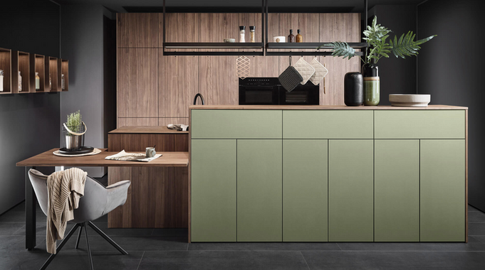 Façades en bois massif, laque mate ou mélaminé texturé,